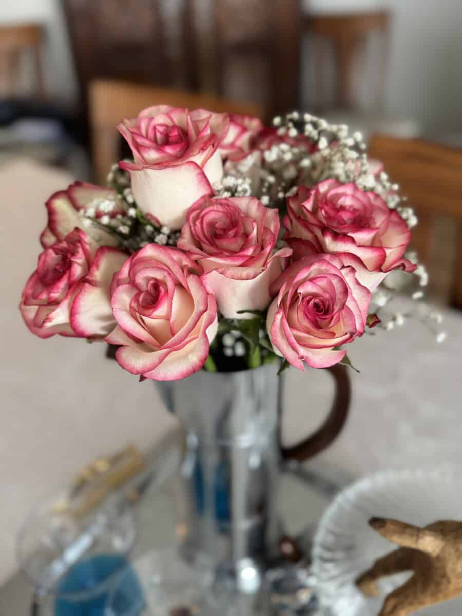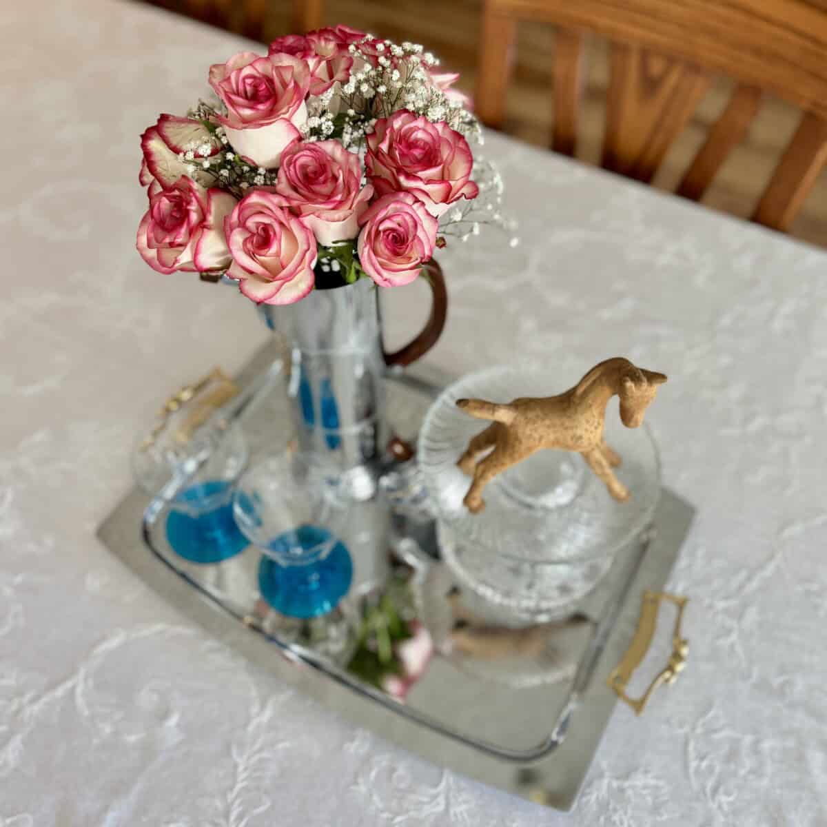 This week’s centerpiece is a nod to the Kentucky Derby as well as to my beloved daughter, whose birthday generally falls during Derby week. I chose variegated pink roses at Shop and Save, as they are her favorite.