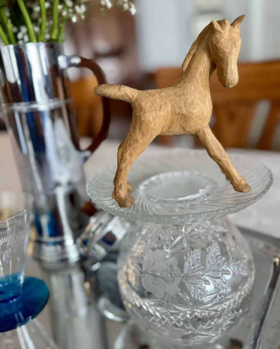 My father carved the little horse and it has such a personality. One of the rules of vignettes is to vary the heights, so I put it on the pedestal I made from an upside-down footed dish and a glass plate from a resale shop. Usually one of my plants sits on it in our kitchen window.