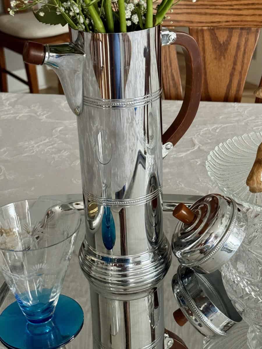 The chrome and bakelite cocktail shaker showed up in my collection years ago – we went through an Art Deco phase and still love the lines. According to Ms Google, it is an “ART DECO Farber Bros. “Krome-Kraft” Chrome and Brown Bakelite Cocktail Shaker, Vintage 1930s Prohibition Era Martini and Cocktail Shaker.” We still use it for fancy parties.